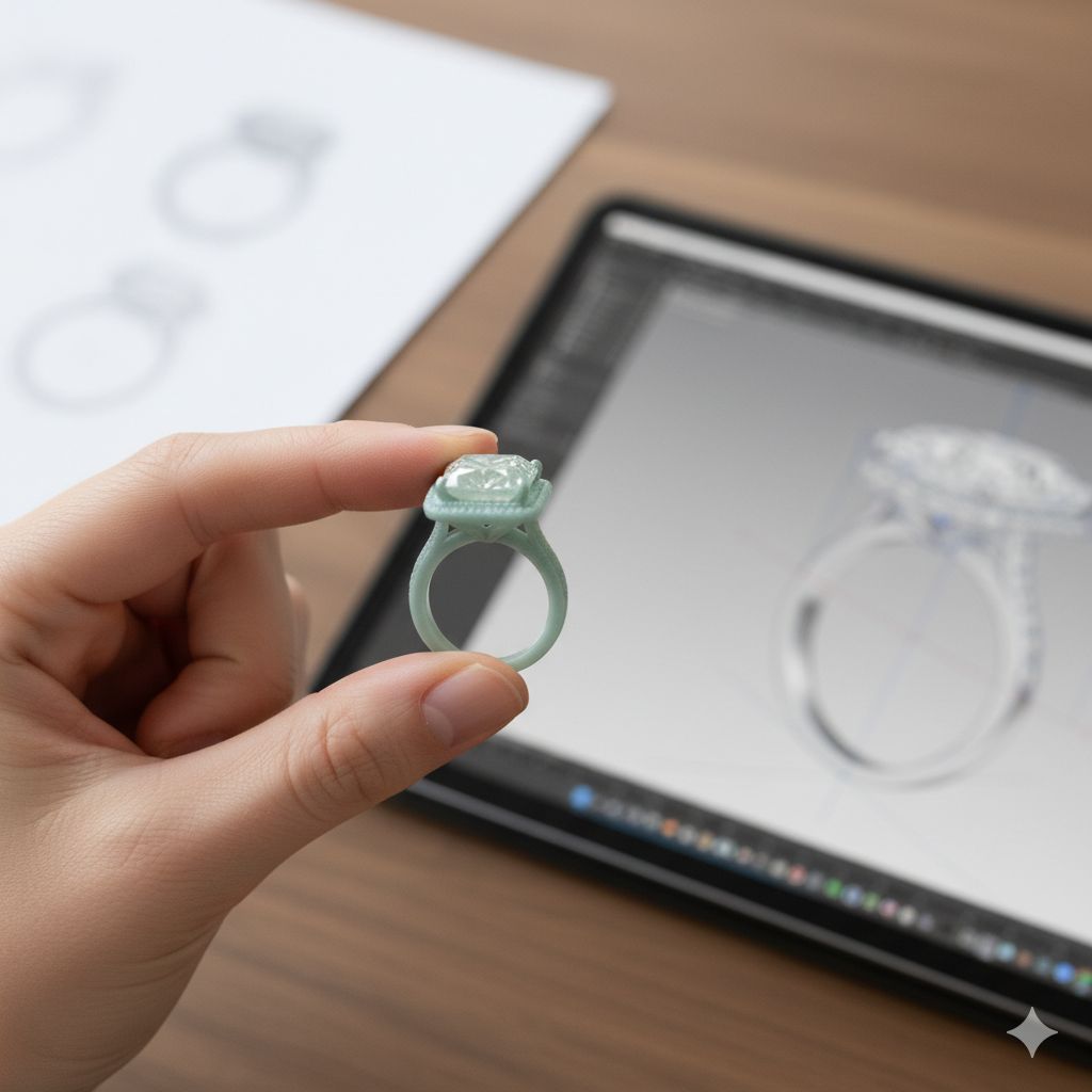 Next, we transform your chosen concept into a precise digital blueprint. Using state-of-the-art CAD (Computer-Aided Design) software, our designers craft a detailed 3D rendering of your ring. This technological step ensures every curve and detail is perfected before moving to the physical model.
